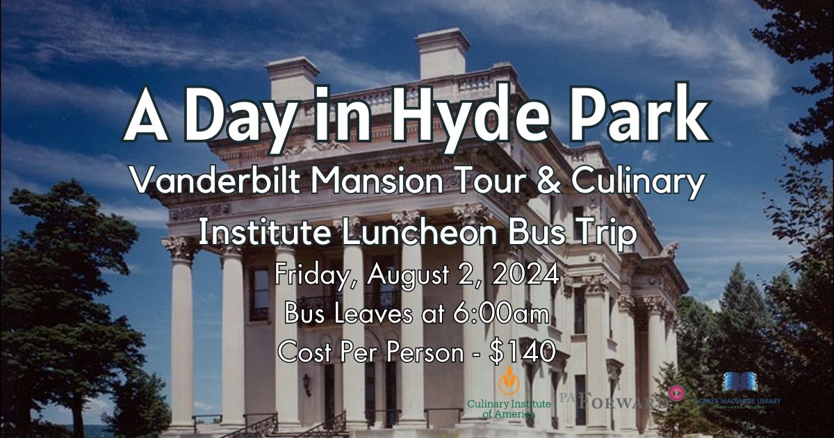 Join Lower Macungie Library as we travel to the Culinary Institute of America in Hyde Park, New York for a tour at 10:15am and lunch at 11:30am. Then we will travel to the Vanderbilt Mansion for a tour at 2:00pm.