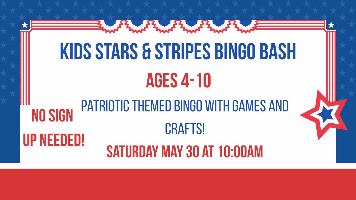 We invite kids ages 4-10 to join us for some fun bingo to celebrate America's 250th birthday. We will play 2 different kinds of bingo using numbers for one game and patriotic pictures for the other. We will have special games for the winners of each round to participate in. Prizes will be given to the winners, and all participants will go home with a small prize. A patriotic craft will be available to do also while they are there or to take home. No sign up is needed. Come join the fun!